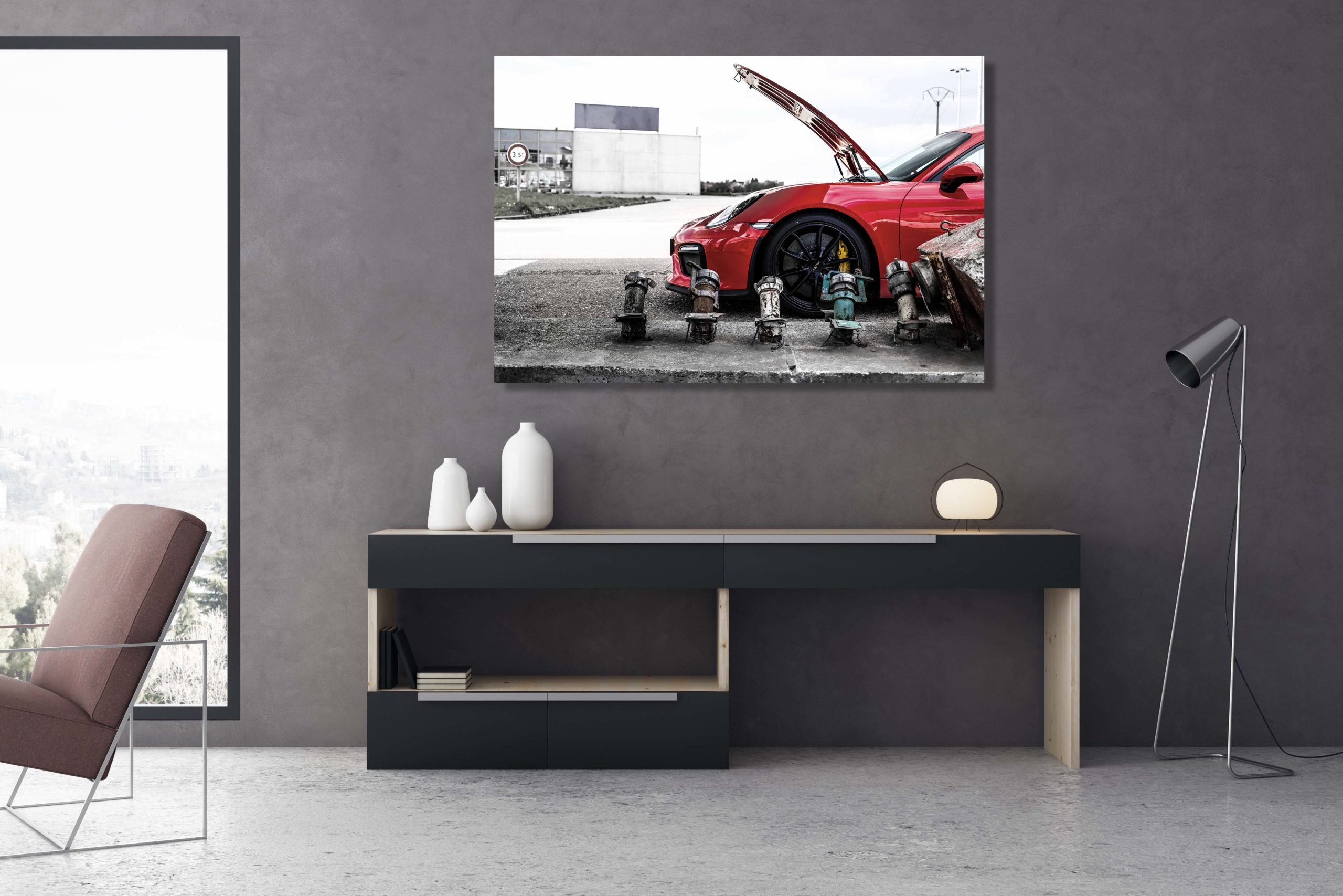 Voici une superbe Photographie Porsche GT4 à la pompe à essence