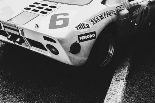La surface de la carrosserie porte les marques de l’intensité de la compétition. Par conséquent, elle raconte les batailles livrées sur circuit. Ces subtiles imperfections, sublimées par le traitement noir et blanc, enrichissent cette photographie voiture collection. En outre, elles transforment ce véhicule en témoin d’une époque légendaire du sport automobile.