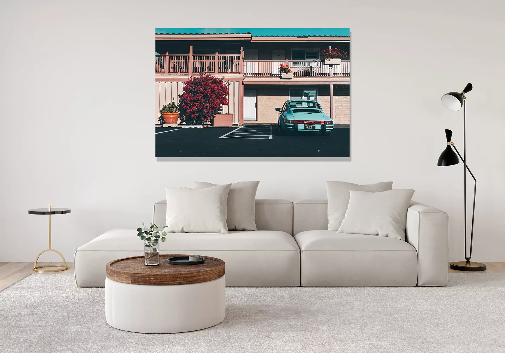 L’architecture caractéristique du motel avec ses balcons en bois, son toit turquoise et ses parterres fleuris représente parfaitement l’âge d’or des road trips américains. La lumière naturelle de Monterey baigne la scène d’une chaleur particulière, accentuant les textures et les couleurs qui définissent cette période.